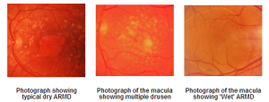 There are two main types of ARMD often termed ‘Dry ARMD’ and ‘Wet ARMD’. The pathological process is different between the two. In the wet form, there is a proliferation of abnormal blood vessels under the macula. In dry ARMD, there is the collection of small yellow deposits within the retina called druse, and degeneration (atrophy) of the retinal tissue at the macula. The dry form is more common, but the wet form is usually more sudden and devastating to the vision.